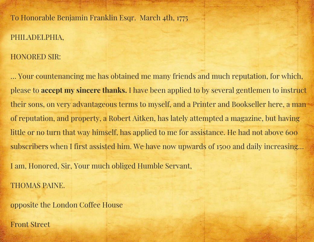 PAINE’S THANK YOU NOTE TO BEN FRANKLIN